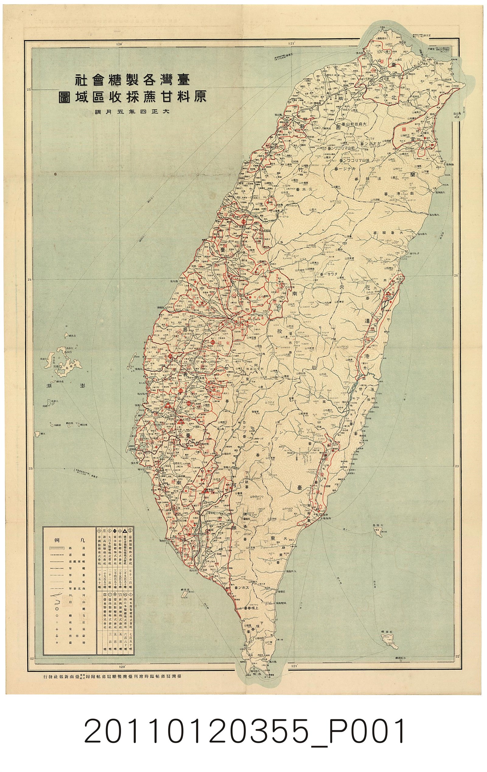 本圖顯示了較早期(1915年)的臺灣的製糖工廠的位置,與原料採集區域的分布。1905年,製糖原料採取區域制度確立,1910年,5個製糖會社發起組成臺灣糖業聯合會,後創設糖業研究會。當時臺灣共有臺灣製糖、鹽水港、明治、東洋製糖等13間製糖會社,甚至臺北也有「臺北製糖株式會社」,原料採集區在臺北盆地。
