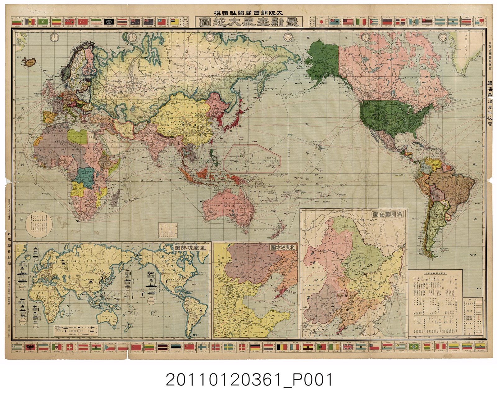 〈最新世界大地圖〉,大阪朝日新聞社特撰,文部省圖書監修官碧海重溫校閱,《大阪朝日新聞》第18438號附錄,精版印刷株式會社印刷,昭和8(1933)年3月5日發行。