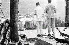 中國石油公司苗栗出磺坑油田A2號及A3號新油井開鑽典禮,於民國41年6月22日下午1時,在A2號新油井現場隆重舉行。典禮由我國經濟部長張茲闓主持,美國安全總署遠東計畫助理署長戴克、安全分署署長施幹克與苗栗縣長賴順生、臺大教授宋希尚、中油公司總經理金開英、臺灣油礦探勘處處長董蔚翹、副處長吳德楣及該處各主管幹部暨有關工作人員等20餘人均出席盛典。經濟部長張茲闓在致詞時首先報告新井開鑽之意義,並對美國安全總署對我國之援助,深致謝意;繼由戴克及施幹克分別致詞,對臺灣積極邁向工業化的努力,表示肯定與支持之意。圖為新油井開鑽典禮中,美國安全總署中國分署長施幹克博士(右,背對著)應邀致詞情形,左背對著為我方翻譯人員。