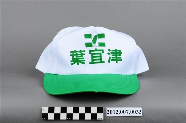 此為一鴨舌帽,印有「葉宜津」及民主進步黨黨徽。為中華民國第八屆立法委員選舉,臺南市第一選區(後壁區、白河區、北門區、學甲區、鹽水區、新營區、柳營區、東山區、將軍區、下營區、六甲區、官田區)民主進步黨籍立法委員候選人葉宜津的競選宣傳帽。