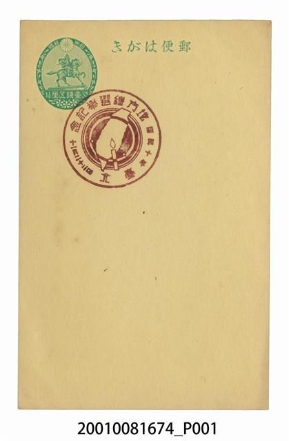 1. 本物件為蓋有地方總選舉臺北紀念戳章之明信片,以綠色單色印刷,左上方印有1橢圓形圖樣,文字由上至下為「日本郵便」、「N.S壹錢五厘1½」;圖樣由上至下為菊花,穿著盔甲的騎馬武士,以及3朵櫻花;明信片上方有「郵便はがき」 ,中央偏左上位置蓋有1暗紅色圓形戳章,文字由上至下為「地方總選舉記念」、「昭和十年」、「臺北」、「十一月二十二日」,戳章圖樣中央為臺灣島嶼之輪廓,並有1根點燃的蠟燭圖樣;背面為一片空白。