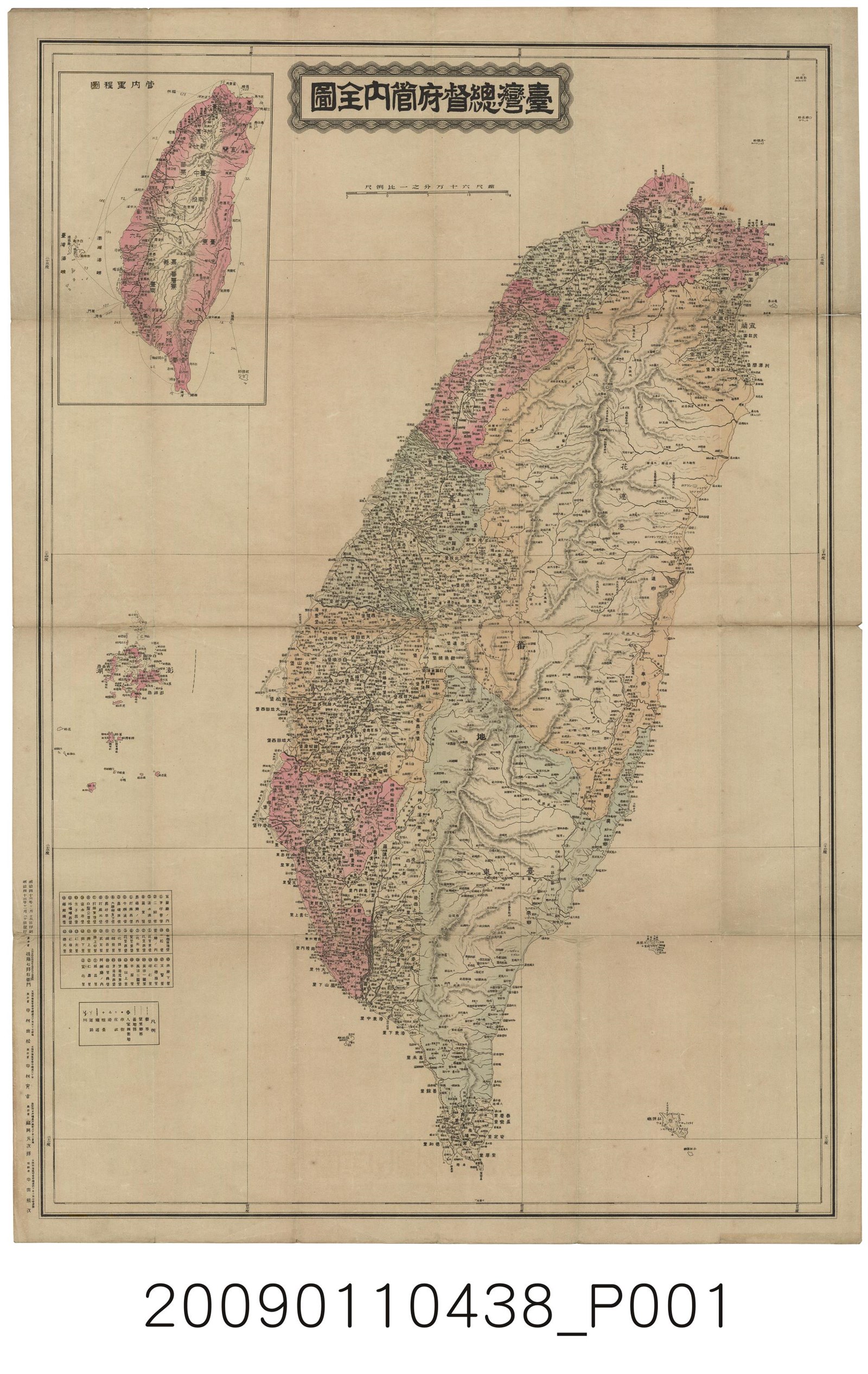 後藤七郎右衛門編纂〈六十萬分一臺灣總督府管內全圖〉,彩色石印地圖。明治43年(1910)11月15日印刷、11月20日發行。著作者後藤七郎右衛門,發行者中村由松、中村寅吉、福岡元次郎,印刷者中田熊次。為1909年10月臺灣總督府將行政區20廳合併改為12廳時期的地圖。