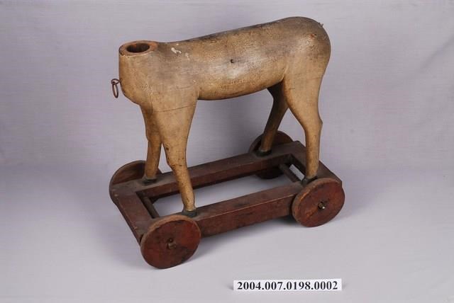 1.本物件為木馬身體,材質為木質,整體保留木頭原色,馬蹄為黑色,下方底座則為深咖啡色,木馬前端洞口為安裝馬頭用,下有小鐵圈,木馬固定於底座上,底座有滾輪可前後滾動。