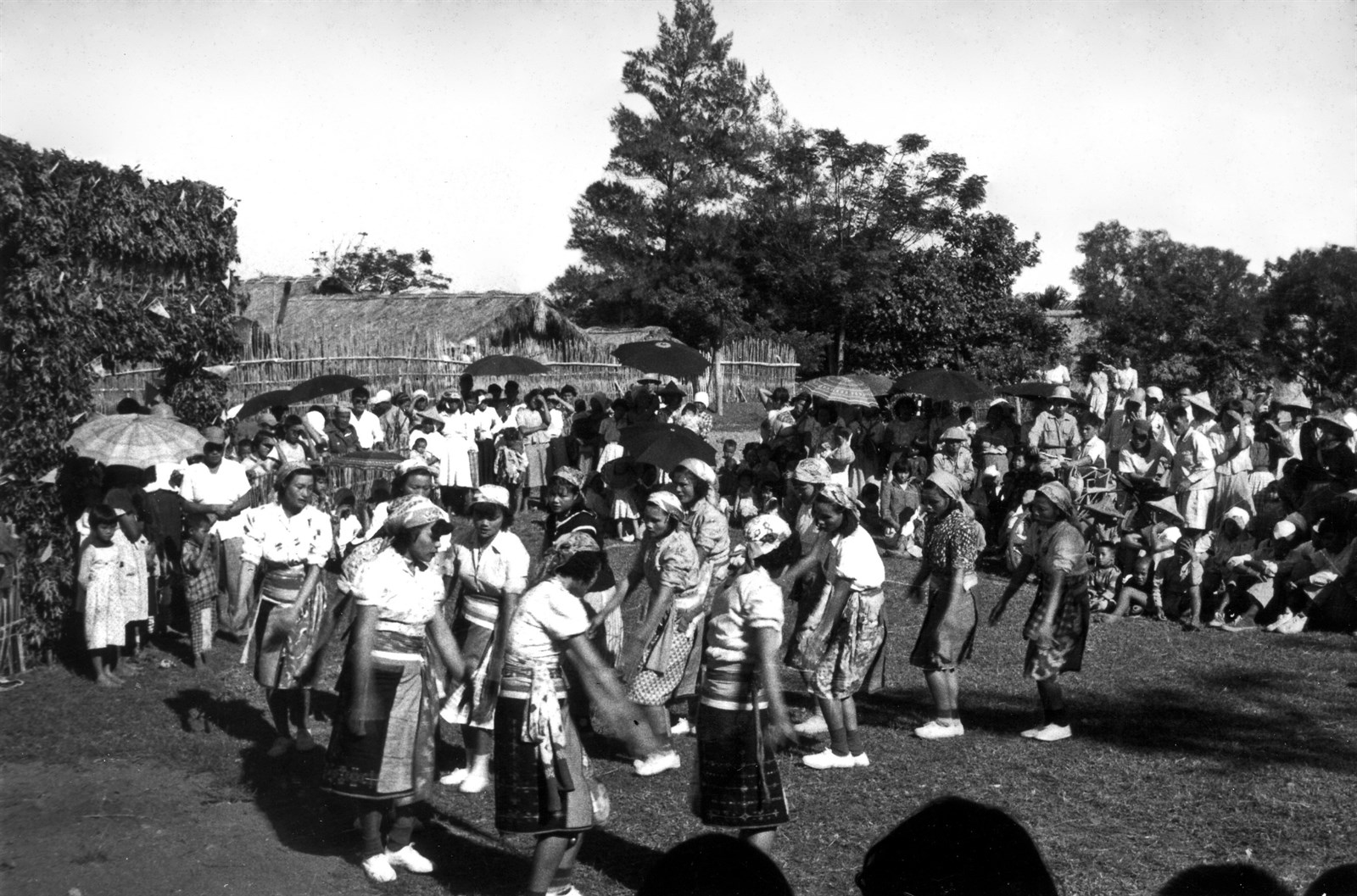 照片為1956年12年8日知本部落卑南族教友以歌舞方式慶祝知本天主堂落成時留影。照片中的女性,身穿女子外裙(irabit dra babayan),腰部繫著腰帶,頭戴女子頭巾(salrianung)。早期的女子外裙多以單色底布製作,並在布邊或布面上貼縫印花布或刺繡裝飾。到了今日的女子外裙,則改以黑底或藍底印花布直接裁製。