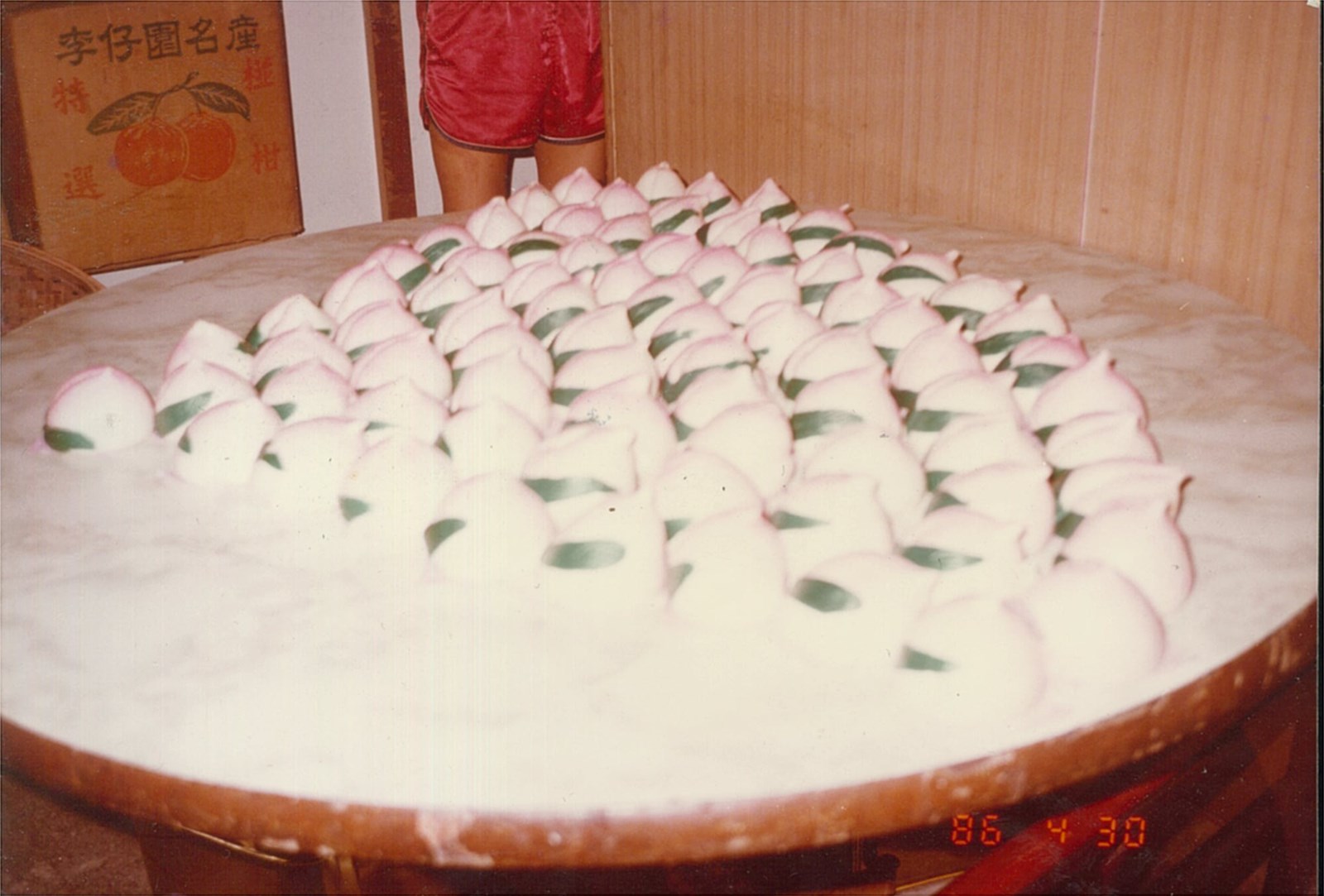 照片為製作完成之壽桃,攝於1997年,出貨前將壽桃擺放為扇狀。慈恩壽桃素食專賣店於1980年代開始製作壽桃,是當時主要的販售品項,也是二林地區最早開始製作、專賣壽桃的店家。1990年代製作壽桃時,仍會在壽桃外側放上兩片桃葉,直至2000年後,逐漸改為桃葉印章印製,甚至是塑膠葉片,或者直接於包裝外印製葉片圖樣,以節省製作時的工序。