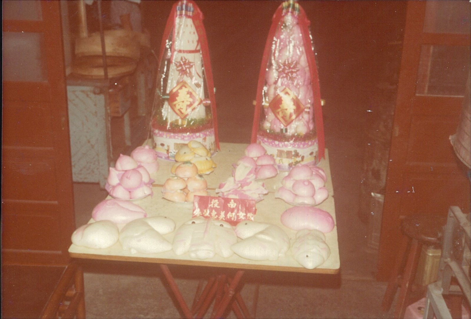 照片為客人祭拜天公的景象,攝於1997年。供桌最前排為素食五牲,包含豬頭、雞、鴨、魚和豬肝,中央則為壽桃、紅圓、紅包子,其中橘色麵食為製成紅柿樣貌的供品,黃色麵食則為製成貝殼樣貌的供品,基本上製程與原料皆類似,僅形式上的變化。後方則為麵線塔與壽桃塔,供桌上即為完整的拜天公素食牲禮。