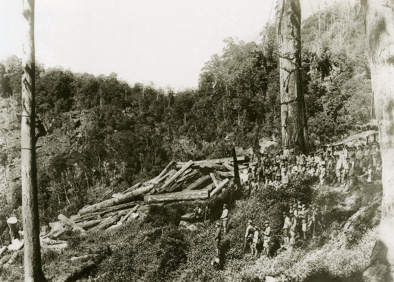 照片是日治時期嘉義農林學校學生到阿里山林場,實地觀摩學習機械集材作業,影像右側有巨大的集材主柱,左側為集材支柱,中間放置已完成造材的木材。