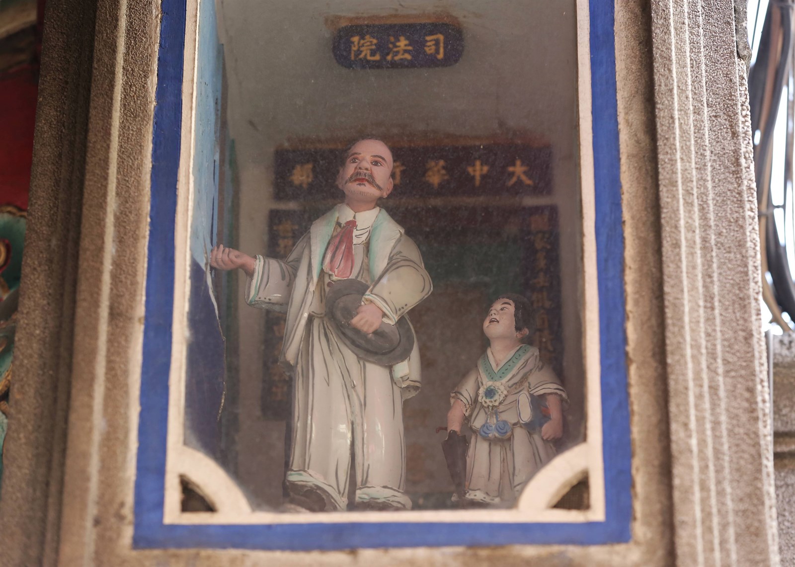 此件為何金龍於1928年整修台南佳里金唐殿之剪黏作品,作品位於三川入口外的墀頭牆上。整修年間處日治時期,帶有強烈民族主義色彩的孫中山像得以在殖民統治下保存實屬不易,此剪黏作品因而有「台灣第一座孫中山像」之稱,也是剪黏作品中少見的現代人物,孫中山先生站在「司法院」匾額前,據推論是臺灣最早出現的國父塑像。