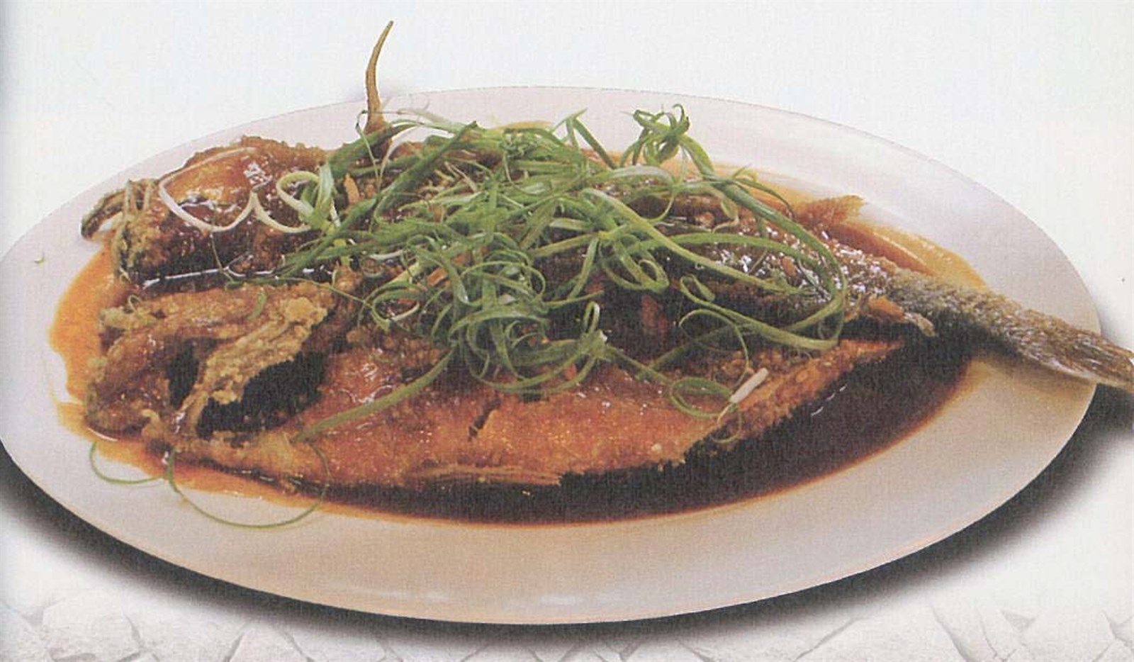 6.取炸好黃魚擺盤,將糖醋醬汁淋上,撒下蔥絲即可上桌。