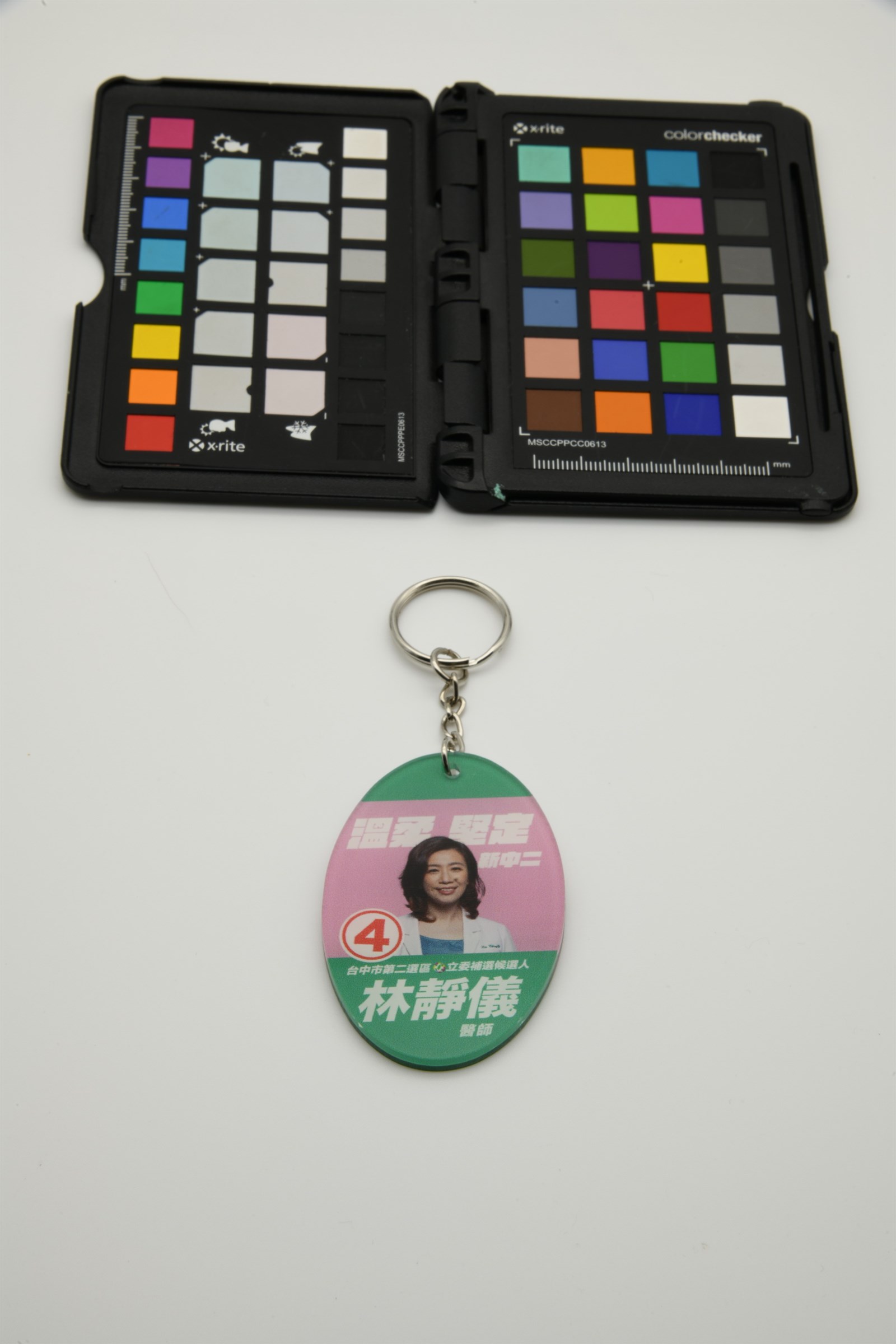 此物件為印有「溫柔堅定 新中二」競選口號,以及2022年臺中市第二選舉區立法委員缺額補選候選人,登記4號林靜儀的肖像版與Q版造型鑰匙圈。