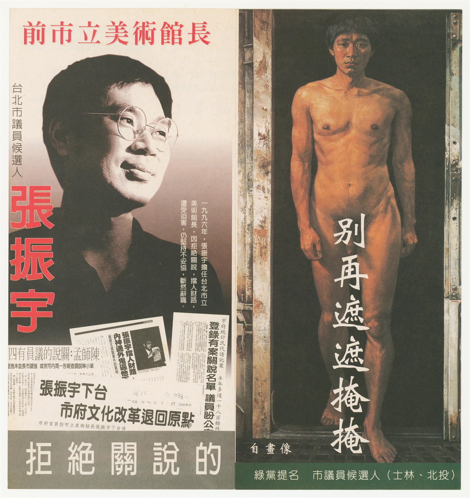 此物件是選舉宣傳文宣,是1998年臺北市市議員候選人張振宇的選舉文宣。曾任臺北市立美術館館長的張振宇,選舉文宣正面是其全身全裸自畫像,並在重點部位寫上「別再遮遮掩掩」字樣。背面則是選舉政見、政治、文化、社會及環保觀點等主張,由於張振宇在北美館館長任內是因爲拒絕關說而後辭職下台,因此「清除政治垃圾」是他最主要的政治觀點。