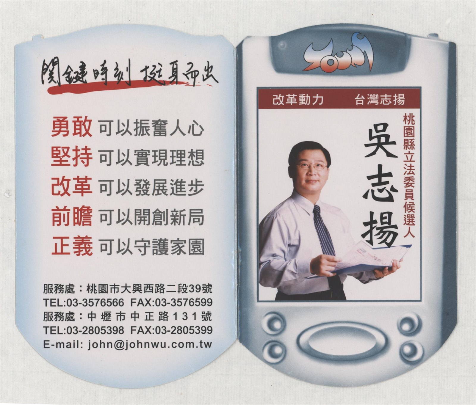 此物件為吳志揚參選2004年第6屆桃園縣區域立法委員選舉時的競選文宣。文宣印有吳志揚的五隻羊綽號、小檔案、學經歷、資歷等等。