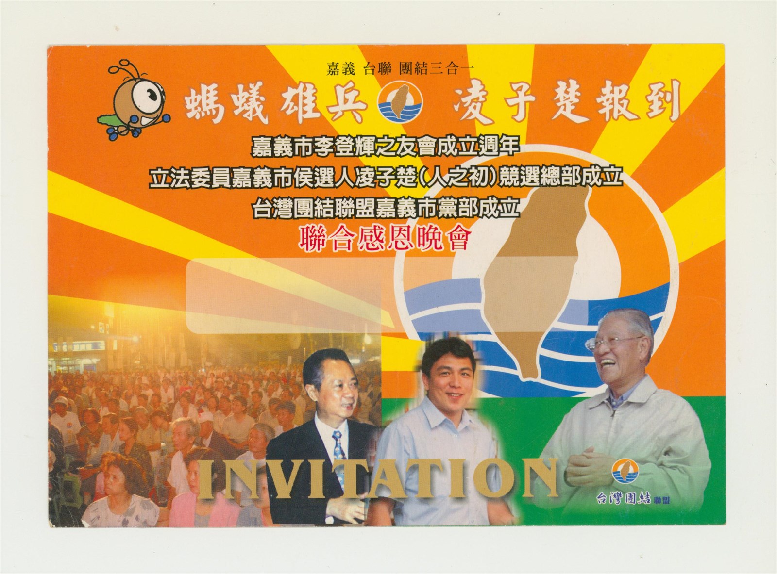 此物件是選舉宣傳文宣,是2004年嘉義市立法委員候選人凌子楚的選舉文宣。這是凌子楚競選總部成立等聯合感恩晚會邀請函,邀請各路支持鄉親選民前往共襄盛舉。
