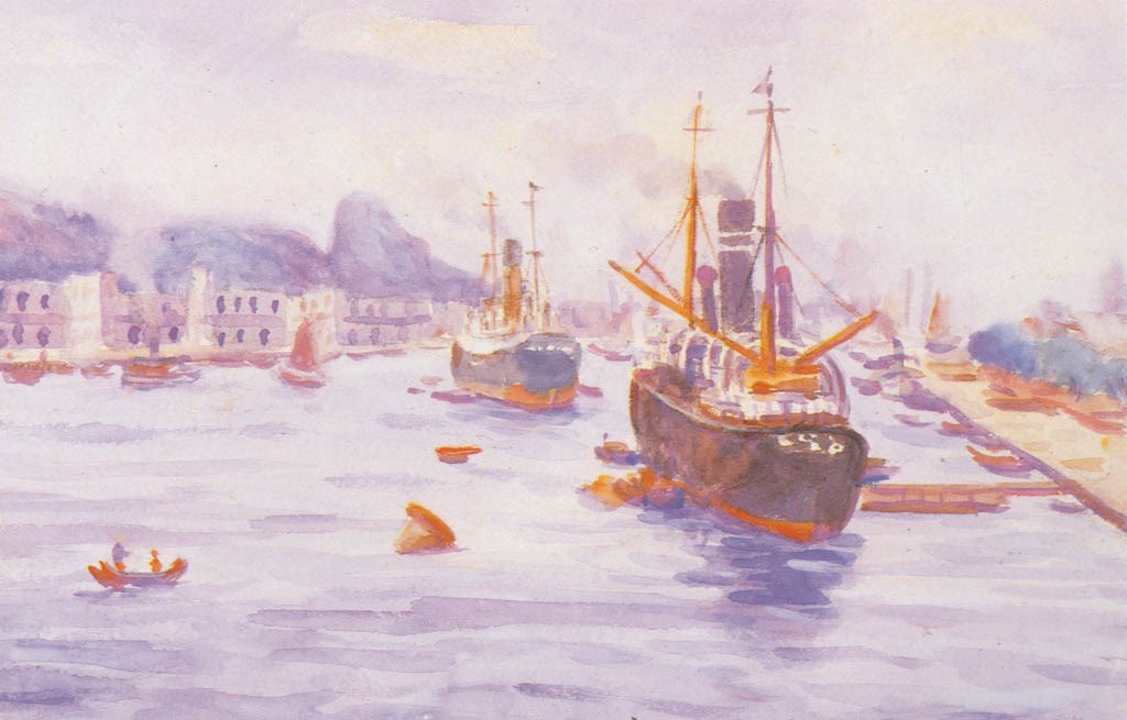 〈進港的輪船〉,創作時間為1931年(昭和6年)3月30日,創作地點在基隆港,由倪蔣懷繪製。由倪氏家族收藏。
