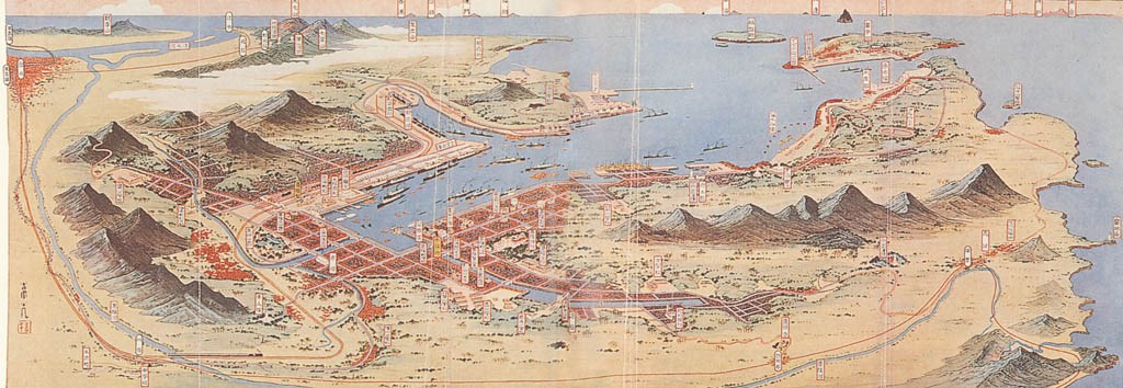 「基隆市大觀」,創作時間為1935年(昭和10年),由日人金子常光繪製。圖中,基隆河流過下方山區,已整治爲運河的田寮港注入港灣東岸;滙合蚵殼港、石硬港爲一體的「旭川」,由西向東流,再轉向北,在港灣南岸入海。