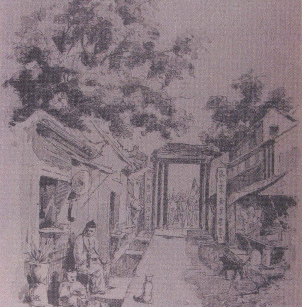 「中法戰爭時的基隆街道」,創作時間為1885年(光緒11年)後,其描繪的地點,即基隆港區市街。