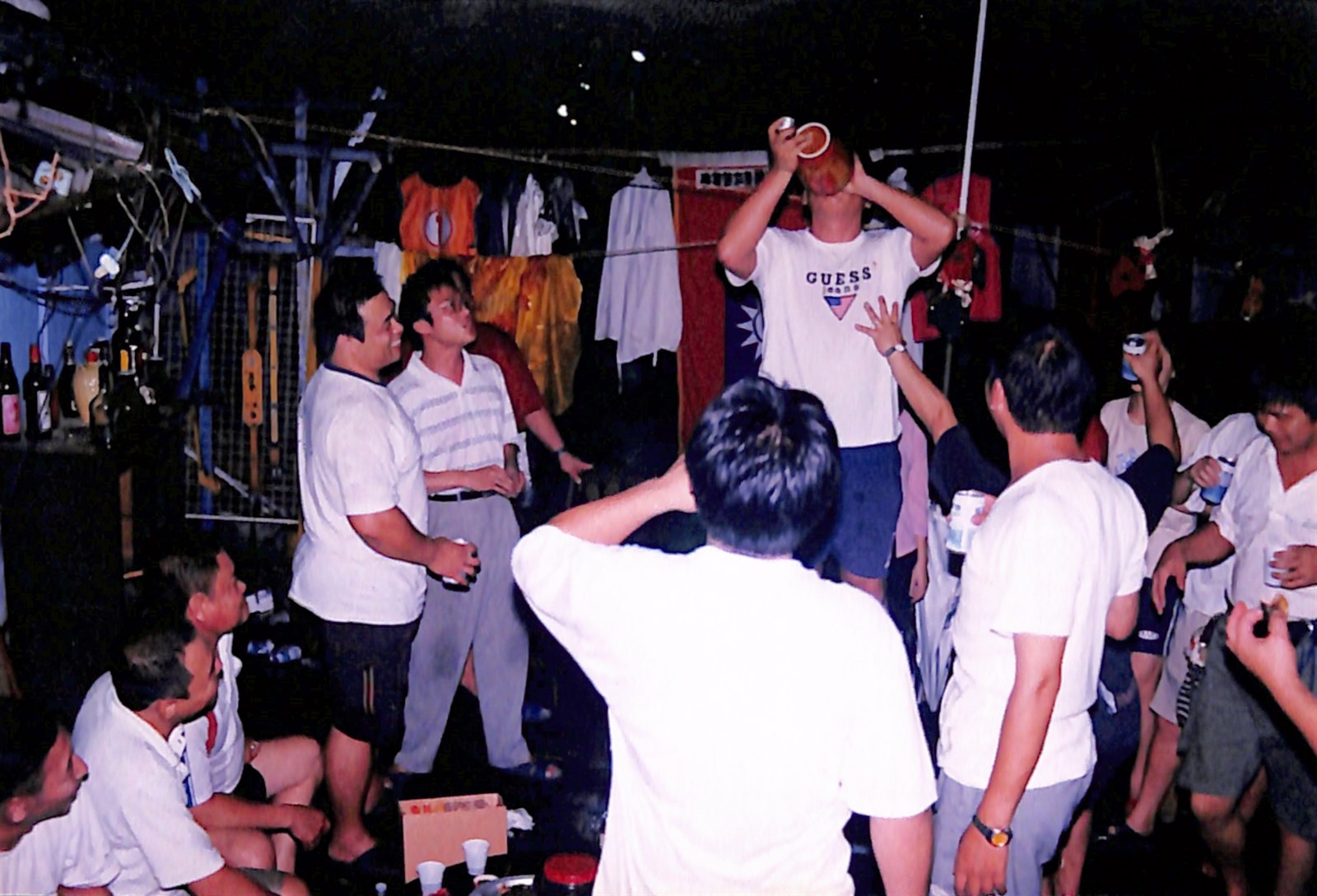 照片中可見十多名年輕人正在聚會,他們幾乎都是在陸光一村長大的眷村第二代,其中有住在506號的胡串龍、531號的徐家寶(綽號阿寶)、528號劉螢光(綽號阿光)與796號黃崇盛(綽號黃牛)等人。一夥人身後掛滿戲服、軍旗、舊衣物,左方黑色櫃子上放著米酒頭、高粱、洋酒等各式酒類,每個人手中幾乎都拿臺灣啤酒相互敬酒,在眾人起鬨中,徐家寶甚至捧起一壇紹興酒灌了起來,博得大家滿堂喝采。