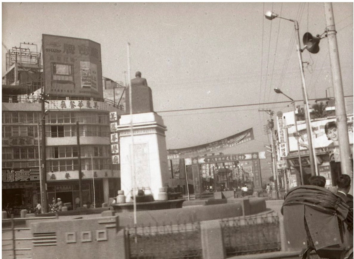 底片主題為嘉義市著名的中央噴水池,當時噴水池中央仍擺放蔣中正銅像。此影像為自圓環朝西側,面向現今中山路的方向拍攝。