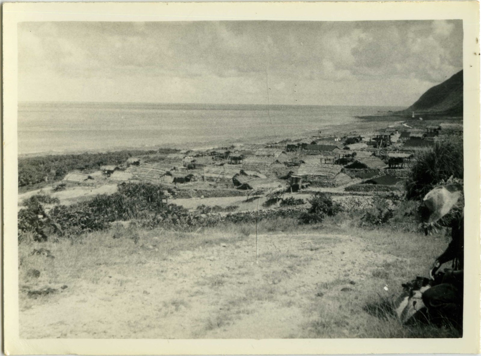 橫式有白色邊框的黑白照片,為蘭嶼野銀部落,可以見到當時蘭嶼野銀部落多是傳統住屋。本照片為廖日京拍攝。