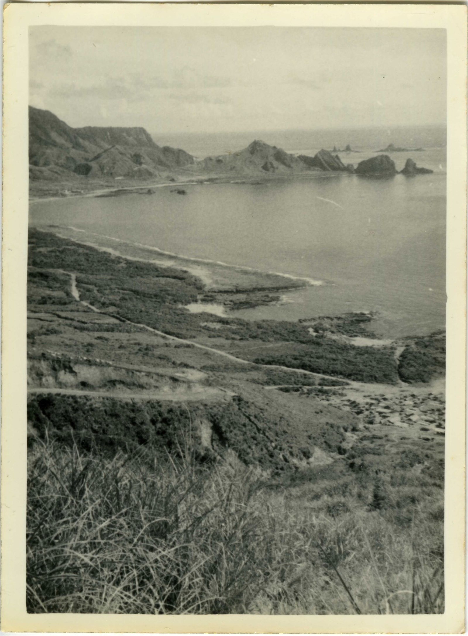 直式有白色邊框的黑白照片,畫面為自蘭嶼中橫公路向東眺望東清灣,右方村落為野銀部落,畫面最上方為軍艦岩。本照片為廖日京拍攝。