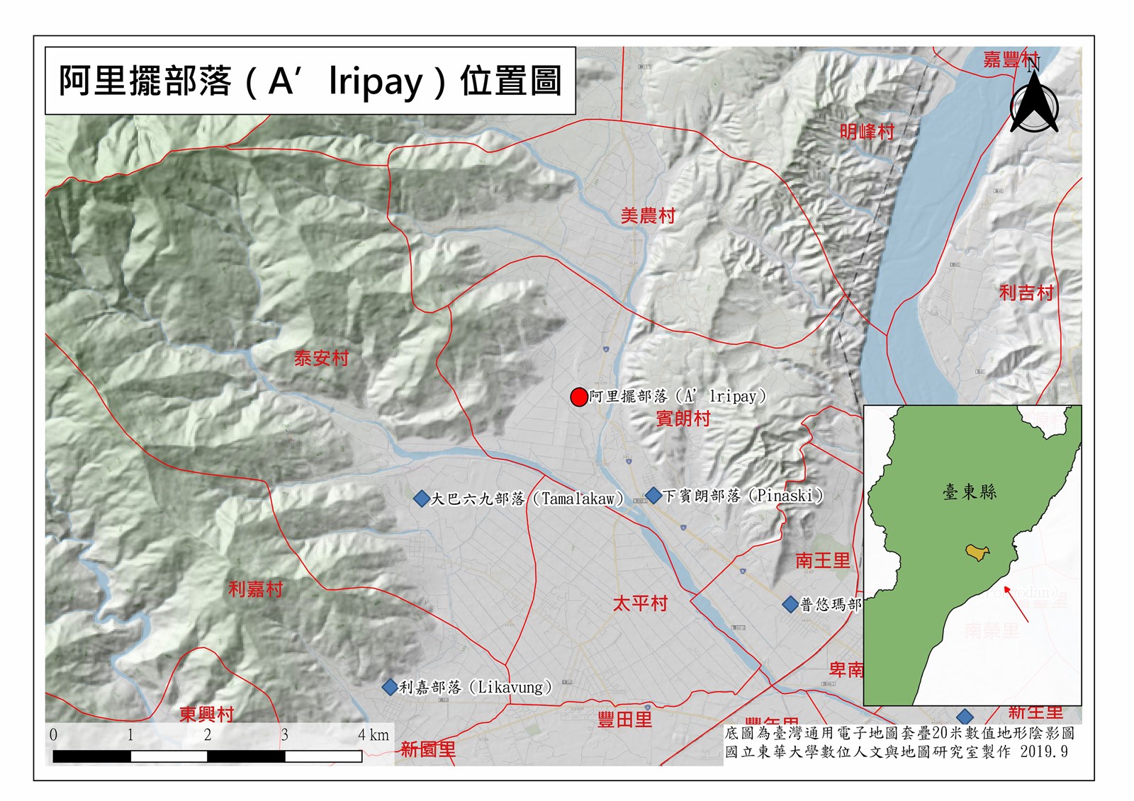 阿里擺部落位於臺東縣卑南鄉賓朗村,在花東縱谷南端起點的左側地方,也是東部幹線台9線的起點。部落地形為平原,鄰近河川,有太平溪,與下賓朗部落屬於相同行政區,兩個部落相距約二公里。村里唯一的學校,賓朗國小座落在下賓朗部落範圍裡,距離阿里擺部落僅約一公里。A’lripay部落屬於卑南八社之一,部落名稱A’lripay是「螞蟻很多」的意思。<br>原民會於2018年出版的《台灣原住民族部落事典》,內容收錄746個部落原民會所核定之部落,作品中將部落定位標示清楚,且詳細寫出部落資訊,配合地圖與實地照片,並能以5種方式檢索。