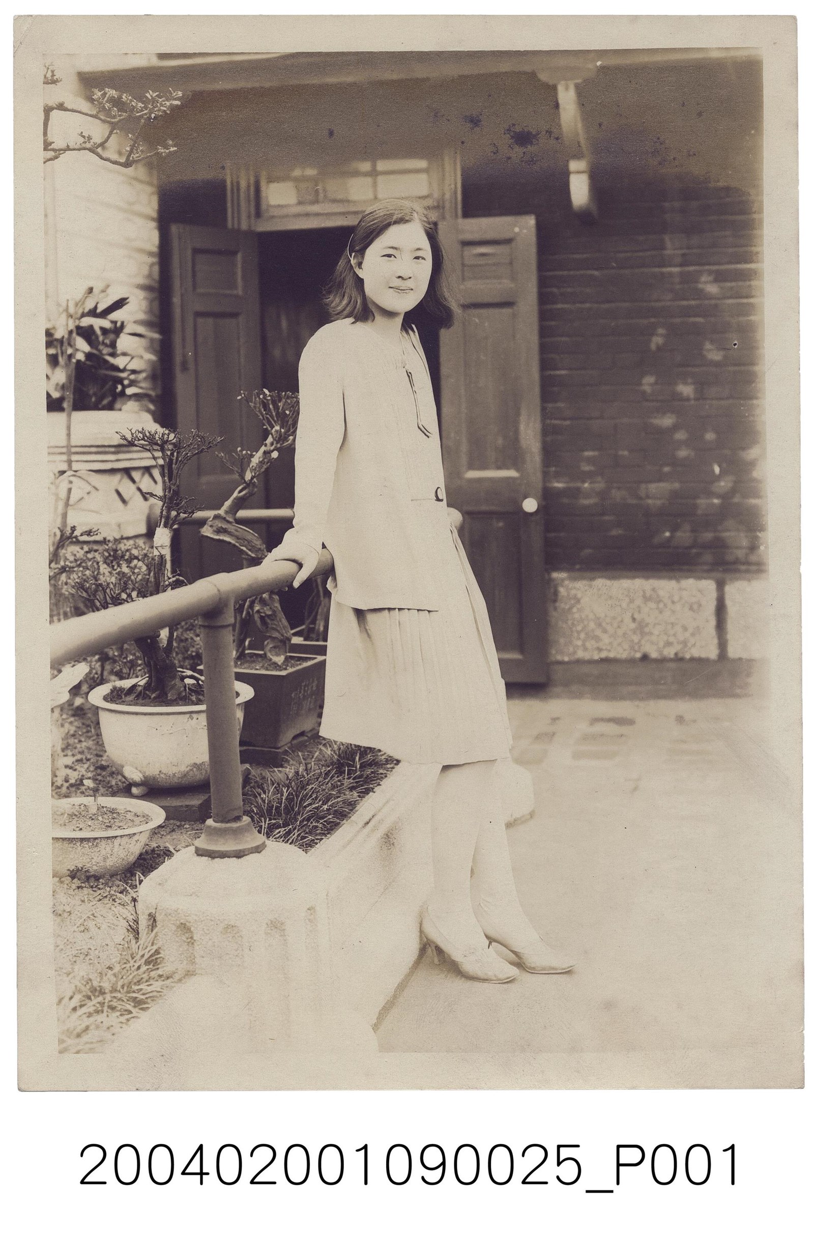 本物件為一女性的黑白獨照。照片中女子身體朝右,臉朝鏡頭微笑;上半身著洋裝,下半身穿裙子,腳穿高跟鞋,身體微靠後方的木欄杆。木欄杆內可見數盆盆栽。照片背景為磚造房屋,牆壁左方為有兩塊門板的大門,呈開啟狀態。