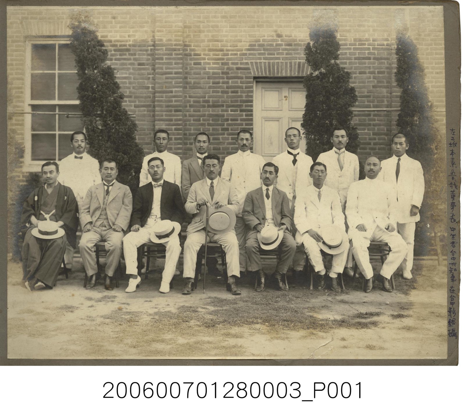 1.本物件為坂本素魯哉董事長及臺中州知事在臺中彰銀前合影,照片背景為戶外涼亭,照片主題為坂本素魯哉董事長及臺中州知事在臺中彰銀前合影,照片中成員有14人,前面7人坐於椅子上,後面7人則站立於後方,成員中有些著日本傳統和服,有些則著臺灣服裝,還有著西裝,整張照片有些許斑駁泛黃。