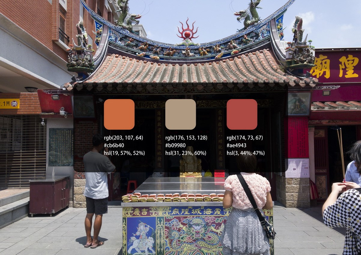 霞海城隍,原係福建泉州同安下店鄉五鄉莊居民鎮守之神,於清道光年間由善信陳金絨等奉靈來臺,初建廟於艋舺市區東邊的八甲莊。1853年(清咸豐3年)以頂下郊拼毀於兵災,信徒從火焰中救出金身,暫時安置於大稻埕陳浩烈金同利鋪中。1856年(清咸豐6年),乃倡議擇地建廟,地主蘇協臺捐獻廟地,1859年(清咸豐9年),建廟於今址。奉祀霞海城隍主神,並配祀三十八義勇公(即自艋舺護送金身至大稻埕途中受襲死難者)等。廟格局較小只有正殿與拜亭,但香火鼎盛,信徒眾多,每遇祭典盛況空前,有「五月十三人看人,迎神賽會甲天下」之稱,近年經過整修,已經恢復原貌。主要色系以紅色屋瓦為主(#cb6b40),並以淺橘色紅磚牆面(#b09980)和紅色傳統廟宇彩繪(#ae4943)為裝飾。