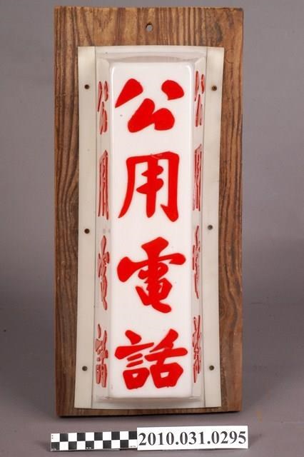 1.本物件為公用電話燈。塑膠燈殼上的三面皆以紅色印有公共電話四字,釘於一長方形木板上,木板最上方有一小孔。