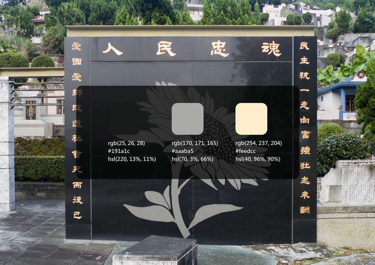 臺北六張犁墓區為部分白色恐怖時期受難者最後安息之地,反映了臺灣地區五0年代政治受難者不平遭遇。墓區內政治受難者墓碑群多低矮,外型、體例尚有一致性,其墓塚與一般民間墓區錯落分布,突顯戒嚴時期的時代氛圍,其空間場域具有歷史事件見證意義。顏色以紀念石碑取色,除以立面底色(#191a1c)為主體,向日葵圖文色(#aaaba5)為副色,並點綴文字黃色色系(#feedcc)。