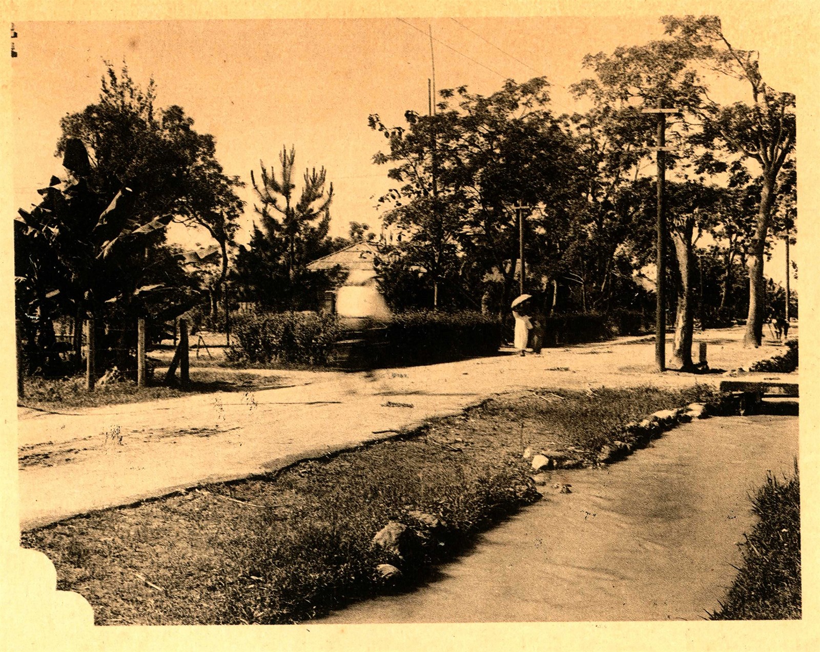 寬廣的道路為縱貫林田村的主要幹道,照片右方還可見到林田圳滿滿的水悠然的流動著。林田村位在今日鳳林車站的東邊2-3公里處,共分為北林、南岡與中野三個聚落,是日治時期於東部的三大官營移民村中,最晚成立規模也最小的村。戰後,林田村改名為大榮里與北林里。在日治時期此地以種植黃色種菸草而聞名,品質為三大移民村中最優的。在今日大榮里中仍能看見許多活化再利用的菸樓,卻也有些菸樓早已埋沒在荒煙蔓草中,見證當地菸業的發展,更訴說著當年移民村人民篳路藍縷的開發史。