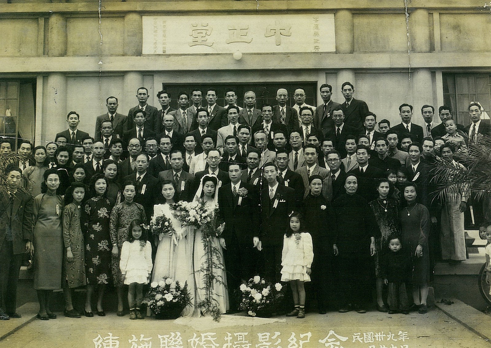 此張照片為民國39年(1950)拍攝於昔日的公正街中正堂前的花鐵貨運首任經理陳仲都之結婚照,民眾穿著西裝、旗袍等服裝,有中西兩派的穿著。中正堂,為過去日治時期所建設之武德殿,在當時大日本帝國之大日本武德會,為了推廣武道而在其本島與韓國、臺灣等殖民地區皆建設了武德殿,以此推廣劍道、柔道與弓道,藉此種方式推廣日本人的核心價值。而照片中之中正堂則是在太平洋戰爭結束後所改建而成,現今則全面拆除改建成了商店。照片由戴陸山提供。