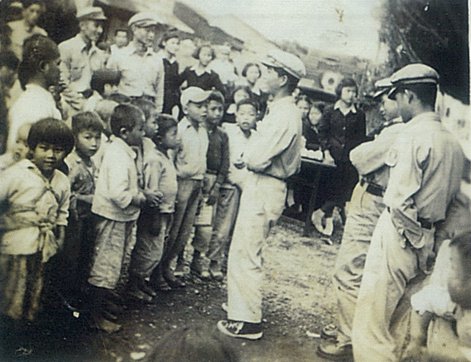 此張照片為民國45年(1956)花師實習生之活動宣導時的影像留存。花蓮師範學校,其創校於戰後初期1947年,舊址位在花崗國中。而經過了多年以來的改制與合併後,成為了現今的國立東華大學創新研究園區,且其位置則位在美崙山上,在此的前身則為國立花蓮教育大學,為老一輩的花蓮人腦海中不可抹滅的一段回憶。而從照片中可以清楚地看到當時的學生除了學校的課業以外,還要進行教育的實習,照片中的小學生有打赤腳的,有背弟弟上學的,可見當時依然是一個貧窮的年代,也為其留下了歷史之見證。照片為賴香蘭提供。