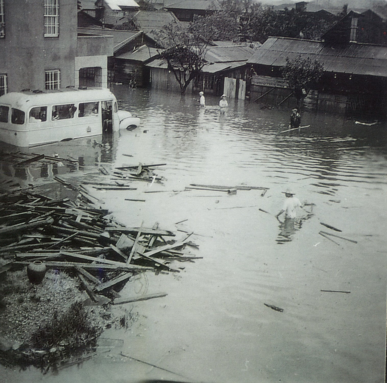 溫妮颱風發生於民國47年(1958)7月13日至17日,為造成花蓮重大災情的強烈颱風。溫妮颱風造成數千棟建築被沖刷或摧毀,蘇花公路、中橫公路也因路段崩塌而交通中斷,多處地區停電,以及造成近百人的傷亡。此圖可以看出當時花蓮市區淹水的慘況,水淹過了將近人身高的一半,大部分的建築都泡在水裡,或是被吹垮,路上的行人則是寸步難行。經由數年的修復、建設後,花蓮市區開始重新恢復朝氣,成為比以往更繁榮、熱鬧的商圈。此照片由蕭海晏提供。