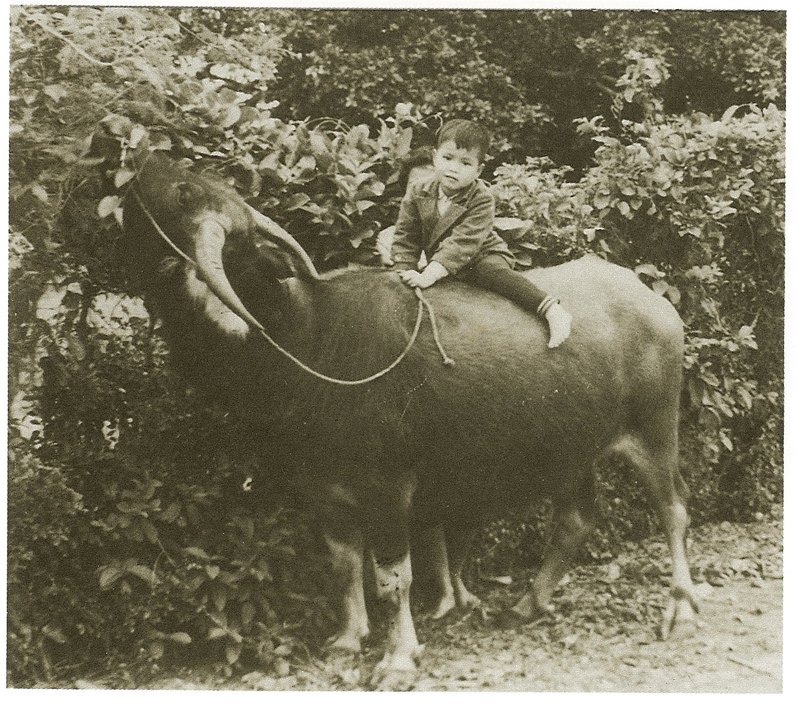 這張照片拍攝於1966年(民國55年)。照片裡,有一個六歲的小男孩坐在小牛的背上,他的名字叫游進榮,是照片提供者的舅舅。臺灣的牛種大致可分為四種:黃牛、水牛、荷蘭牛、聖達牛,黃牛為最早被引進臺灣的牛種,水牛其次,荷蘭牛、聖達牛則分別為日治時期、戰後所引進。荷蘭牛是臺灣主要生產用乳牛品種,聖達牛則作為肉牛被引進臺灣,多與黃牛雜交,現在在臺灣的純種已不多;黃牛、水牛作為工作牛,是早期臺灣農家不可或缺的工作夥伴。水牛較不耐熱,工作時需要幫牠灑水降溫,時常能看到農家牽著水牛去池塘泡水消暑的畫面,因為需要較細心的照顧,水牛與農家常有很深的羈絆與情誼。照片提供:蕭靖哲