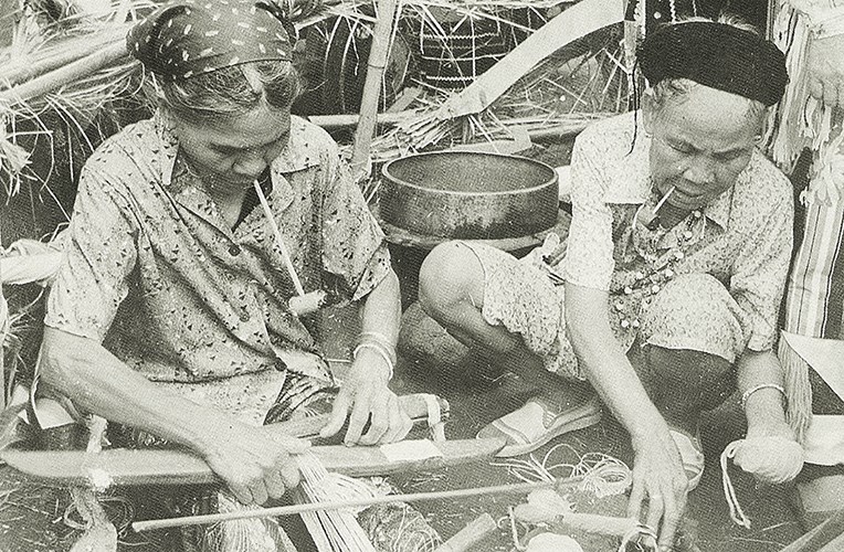 照片拍攝於1980年代,兩位玉里鎮松浦村的阿美族年長女性在豐年祭中示範織麻技巧。阿美族的服飾稱作Riko或Fodoy,以麻、皮革為主要原料,有時會用到樹皮布、草和藤。阿美族的服飾從外觀上可分辨出穿著者的年齡與身分地位:18歲以前的男子著短裙、束腹帶,成年後則著全套服裝,包含頭飾、頭巾、長袖短上衣、霞披、綁腿褲或是流蘇裙;女性則以大、小花帽表示年齡長幼。編織是阿美族女性的專業技能,豐年祭穿著的禮服都是由家中女性負責製作,這是傳統阿美族男性如此尊重女性的原因之一。照片提供:羅清祥。