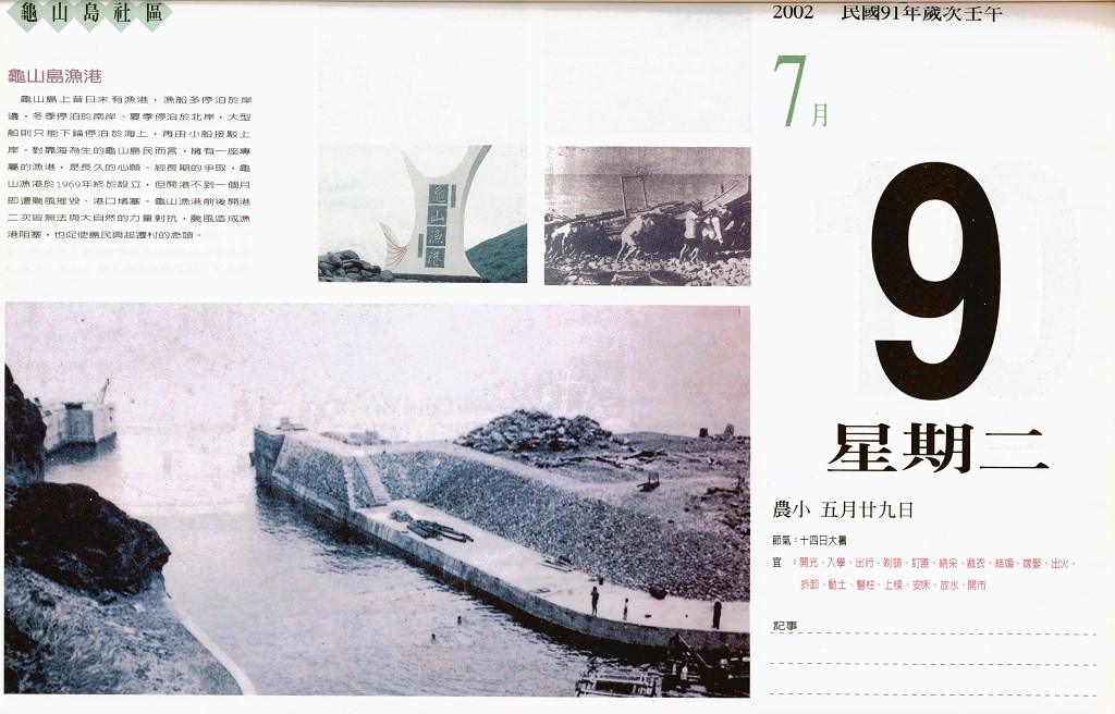 2002年社區日曆計包含:宜蘭市中正、民負;蘇澳鎮白米;三星鄉天送埤;羅東鎮羅東;礁溪鄉三民;頭城鎮龜山島;冬山鄉珍珠;員山鄉阿蘭城;大同鄉崙埤;五結鄉大二結;以及南澳鄉碧候等十二個社區,本月份是屬於龜山島社區的日曆。本篇7月9日的主題是「龜山島漁港」,屬於社區資源分類架構「人、文、地、景、產」的「產」類。其內容介紹『龜山島上昔日未有漁港,漁船多停泊於岸邊,冬季停泊於南岸、夏季停泊於北岸,大型船則只能下錨停泊於海上,再由小船接駁上岸。對靠海為生的龜山島民而言,擁有一座專屬的漁港,是長久的心願。經長期的爭取,龜山漁港於1969年終於設立,但開港不到一個月即遭颱風摧毀、港口堵塞。龜山漁港前後開港二次皆無法與大自然的力量對抗,颱風造成漁港阻塞,也促使島民興起遷村的念頭。』