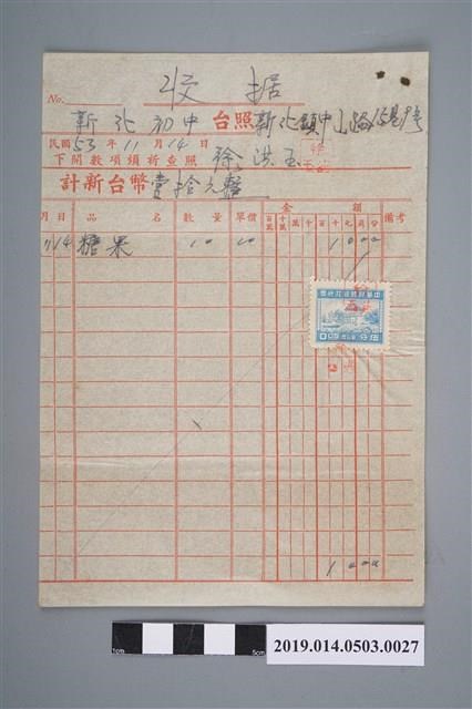 徐洪玉民國53年11月27日予新化初中的收據(火柴、洋燭) -