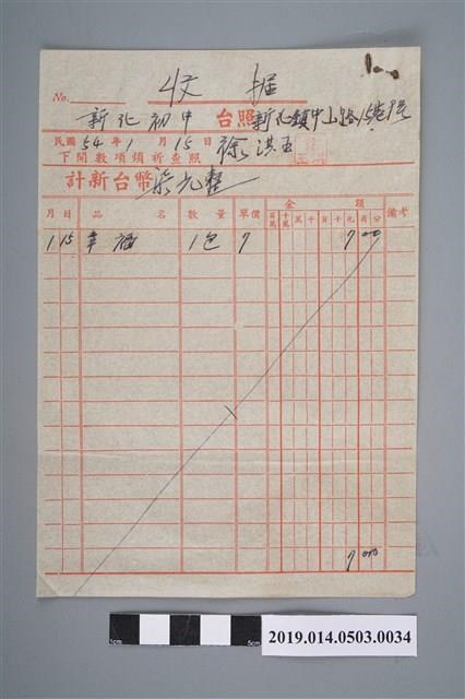 徐洪玉民國54年1月25日予新化初中的收據 -