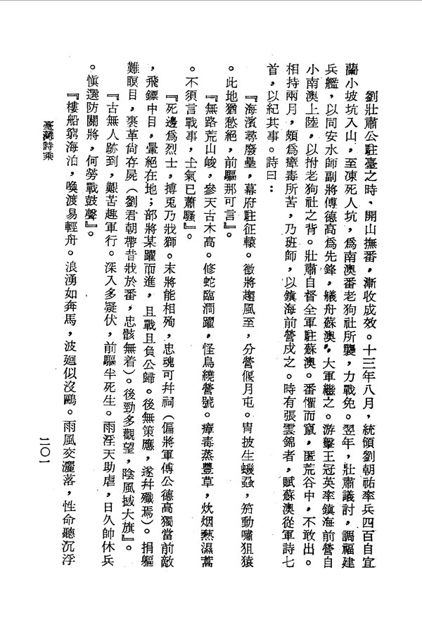 劉銘傳督軍蘇澳,與番相持兩月,頗為瘴毒所苦,乃班師戍之 臺灣詩乘卷五 台灣文獻史料叢刊 -