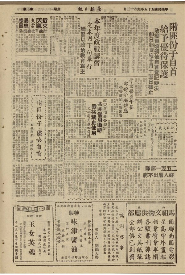 馬祖戰地政務委員會頒布馬祖地區公教人員及民眾被迫附匪人員辦理自首登記辦法-馬祖日報 -