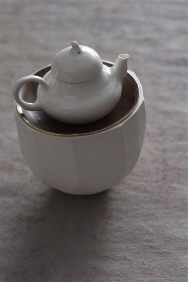 2019年4月24日至5月5日臺灣文博會工藝館,茶3.1415展場中蔡宜芳的作品「蕪白系列-小壺茶具組」 -