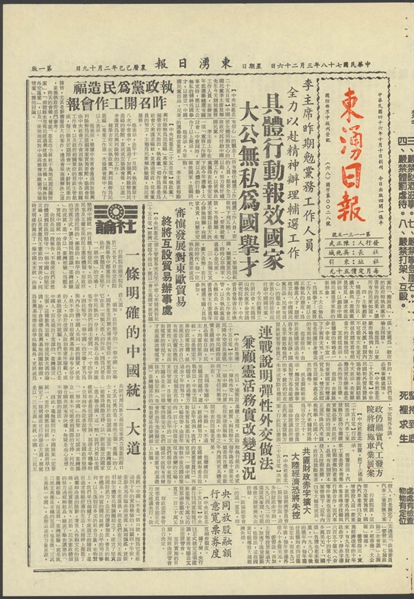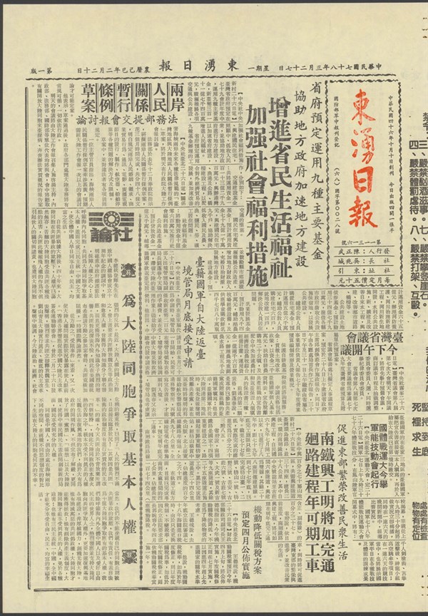 中華民國78年3月27日東湧日報第一一三一六期第一版 -