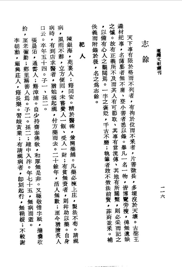 李朝勳行醫不較謝金 苑裏志下卷 台灣文獻史料叢刊 -