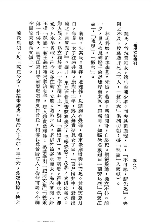 義娘投東嶽廟道旁井而死,鄉人為其立祠於井上,號曰「義娘井」,時有病者得井水飲則癒 廈門志卷十四 台灣文獻史料叢刊