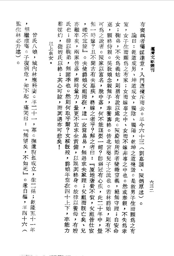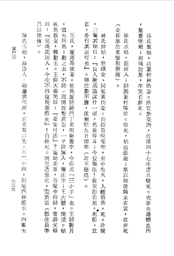 陳氏雪娘夫病癆而死,雪娘亦閉門絕食自殺 廈門志卷十四 台灣文獻史料叢刊 -