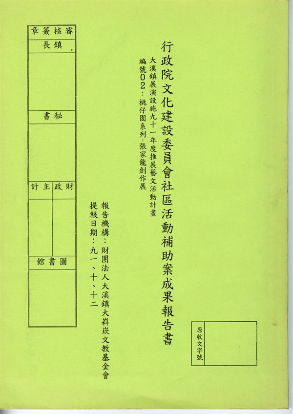 行政院文化建設委員會社區活動補助案成果報告書大溪鎮展演設施九十一年度推展藝文活動計畫編號02:桃仔園系列─張家龍創作展 -