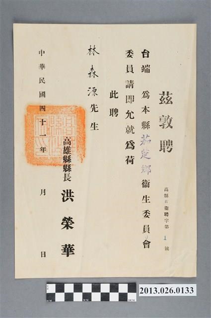 1952年高雄縣縣長聘林森源先生為茄萣鄉衛生委員會委員聘書 -
