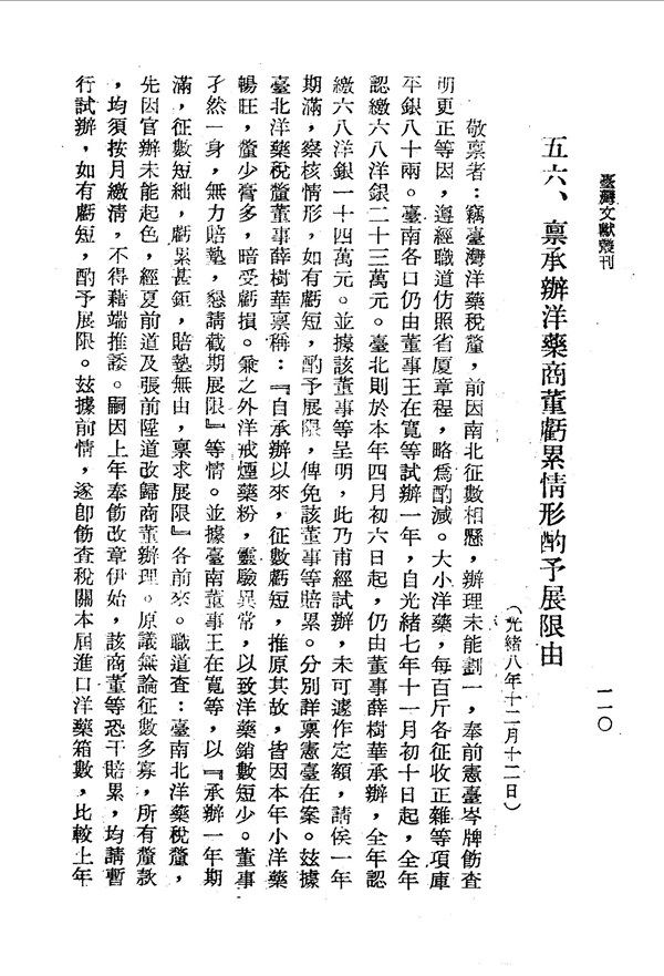 臺南北洋藥稅釐沒有起色,改歸商董辦理 巡臺退思錄卷二 台灣文獻史料叢刊 -