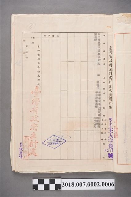 文鍵任臺中高級家事商業職業學校主計室主任之臺灣省政府主計處任免人員通知書 -